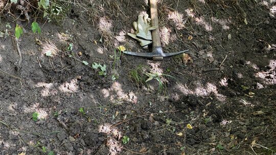 Der Sommer ist die perfekte Zeit, diese Gräben zu bearbeiten. Konkret ging es darum, den Entwässerungsgraben rechts vom Weg in Richtung Gedenkstätte unweit der Bushaltestelle zu vertiefen. Dort fließt ein Großteil des Wassers ab. Wasser kommt durch Regen und schmelzenden Schnee, durch Morgentau und Ausdünstungen.