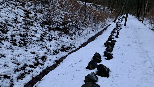 Auf dem ehemaligen Bahndamm, aufgeschichten für den begradigten Verlauf der Bahnschienen. Gräben rechts und links sind Teil des Entwässerungs- & Stabilisierungssystems, das über 70 Jahre alt ist. Es muss erhalten werden, damit der Bahndamm nicht einbricht. Ohne diese Arbeit ist der Gedenkweg unvorstellbar.